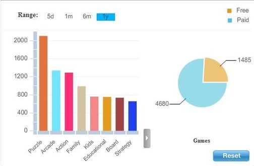 Сайт показывает, что есть в настоящий момент 6,165 геймов, доступных в Магазин Приложения. Из тех 1,485 свободно и отдых для закупки. Mobclix также имеет интересную поломку категорий в пределах iGames, с заглавиями головоломки, изготовляющими более 23 процента смешивания, и аркады в отдаленном во-вторых с 13 процентом заглавий. Это подбадривает, чтобы видеть, что образовательно и геймы детей присоединяют правление и стратегию к смешиванию.